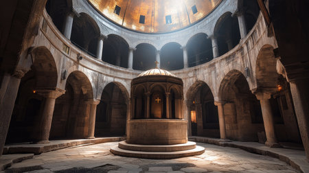Interior of the Church of the Holy Sepulchre, Jerusalem, featuring the Dome of the Rotunda over the Aedicule or Holy Sepulchre chapel. Historic and sacred.