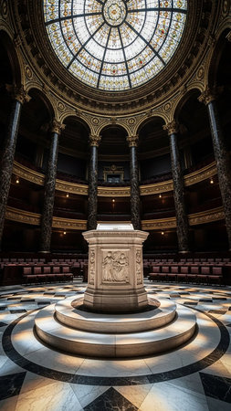 The interior of an ornate circular auditorium features a stained-glass dome, grand columns, tiered seating, and a central marble pedestal.