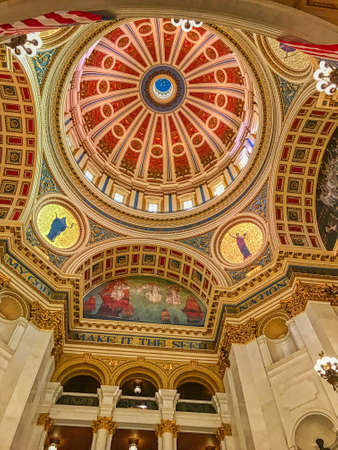 A low angle shot of the beautiful ceiling and walls of Capital Building in Harrisburg, Pennsylvania