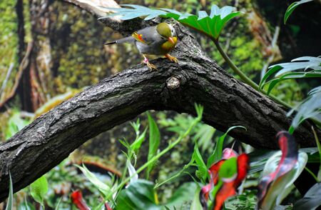 Silver-eared Mesia (Leiothrix argentauris) the beautiful yellow bird and silver on its ears perching on top of the log with lovely actions