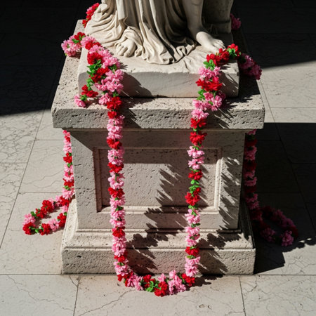 Top-down view of a marble classical sculpture temporarily draped with cheap pink and red fake flower