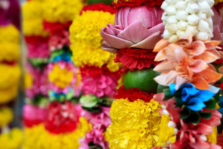 traditional thai flower garlands sold as religious offerings at the erawan shrine in bangkok