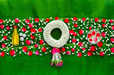 Songkran festival background with jasmine garland, flowers in water bowl, scented water and marly limestone for blessing on wet banana leaf background.