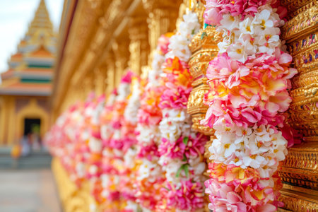Thai floral garlands draped over golden temple gates, representing devotion, cultural heritage, and tradition during the Songkran festival.