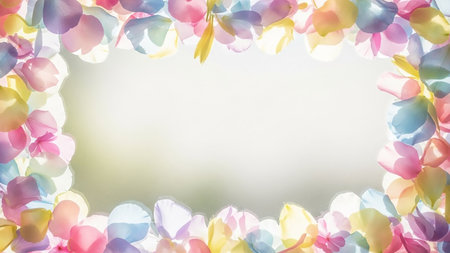A soft frame of translucent pastel flower petals in pink, purple, blue, and yellow against a bright white background with a gentle bokeh effect.