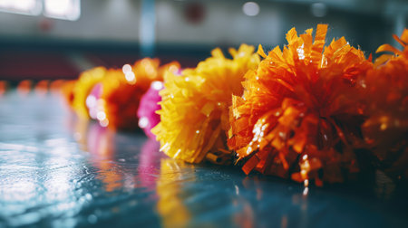 Colorful cheerleading pom-poms on a gym floor