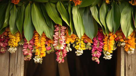 This vibrant tropical flower garland showcases bright petals and lush green leaves, perfect for celebrations or decorative purposes. Nature's beauty at its finest.