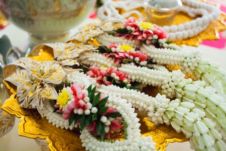Thai garlands laid on the golden bowl