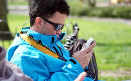Asian tourist man connecting pocket wifi to smart phone while on trip traveling
