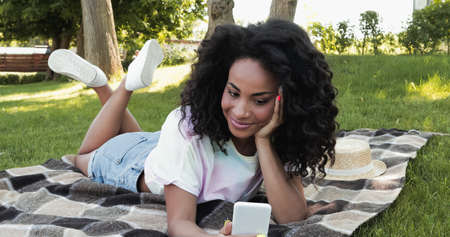 smiling african american woman taking selfie on smartphone while lying on checkered blanket in park