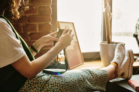 Girl in casualwear looking through images that she took on screen of retro photocamera while sitting by window in loft apartment