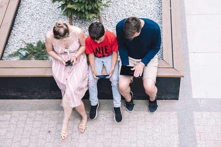 Young family with son all use digital technology mobile phones and tablets in public place on summer day. Modern lifestyle.