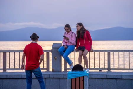 Vladivostok, Russia-September 30, 2018: Young people on the background of the sea and sunset.