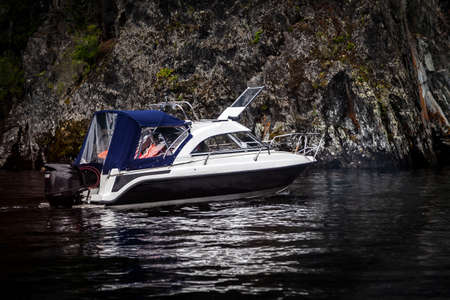 A small pleasure boat with a motor for excursions and relaxation in picturesque places on the water and traveling on a river or lake with tourists. Voyage, fishing and tourism.