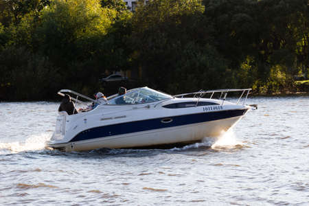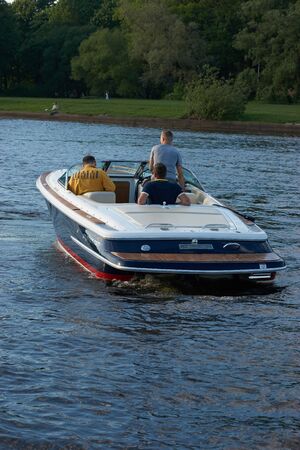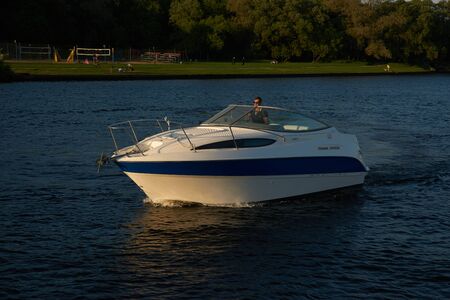 SAINT-PETERSBURG, RUSSIA - MAY 23, 2018: Speedboat or motorboat driving on a water on a sunny summer evening on MAY 23, 2018 in Saint-Petersburg, Russia.