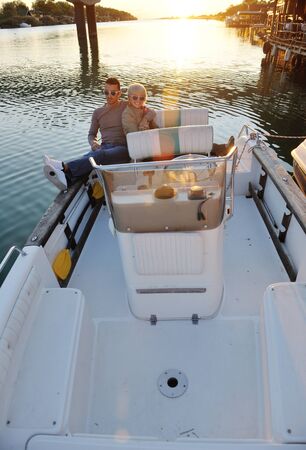 happy young couple in love have romantic time at summer sunset at ship boat while representing urban and countryside fashin lifestyle