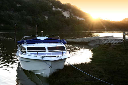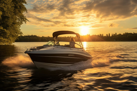 Fishing boat or motorboat on the surface at sunset. Anchored motorboat on the water surface.