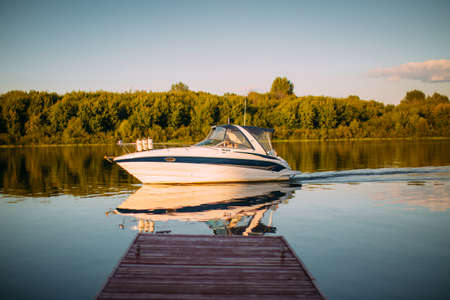 Pleasure boat sails near the pier on tranquil lake or river. Summertime landscape photography