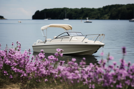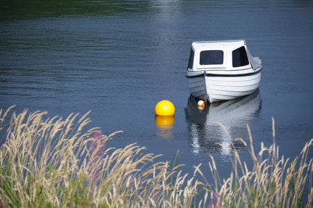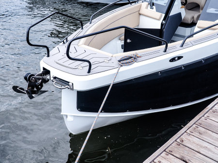 Motor boat or cutter moored to a pier. Fishing, swimming and boating area. Nature, vacations, recreation, ecotourism, lifestyle concepts.