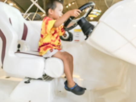 Abstract blurred Asian toddler boy try driving the boat at showroom large outdoor store in Texas, America. Boat buying and servicing concept