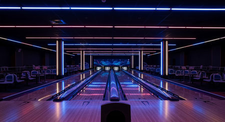 Immersive Retro Bowling Alley Scene with Vibrant Neon Lights Striking Lanes and a Lively Atmosphere of Entertainment and Leisure