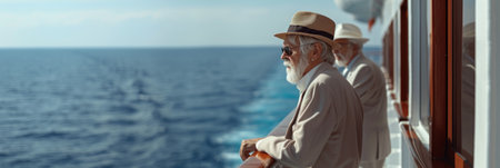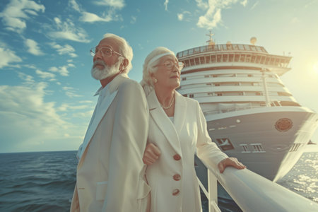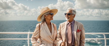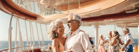 Senior couple traveling together on a cruise ship. Elderly people on vacation.