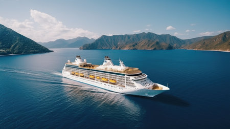 A large cruise ship sailing on a body of water. AI generative image.