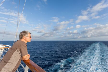 Man looking at the wake left on the sea by a cruise ship