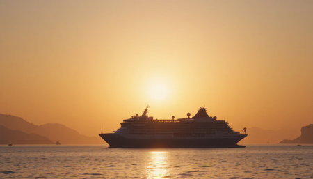 A majestic cruise ship embarks on a journey across the calm sea, basking in the warm glow of sunset. The horizon stretches out, inviting a sense of adventure and tranquility