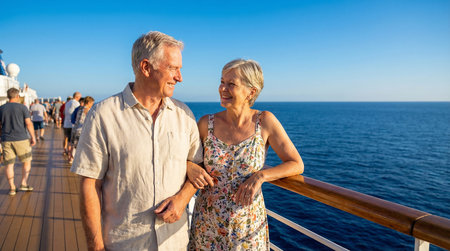 An older couple stands on the deck of a cruise ship. They are smiling and enjoying the ocean view on a bright day. They are dressed casually and seem happy together.
