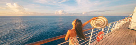 Happy cruise woman relaxing on deck feeling free watching sunset from ship on Caribbean travel vacation. Panoramic banner of sea and boat