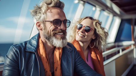 Portrait of smiling mature couple in sunglasses looking at camera while standingof cruise ship