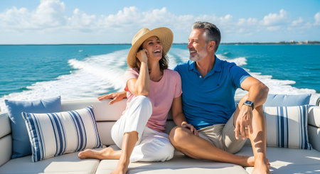 Happy mature couple sitting on yacht and looking at each other on sunny day