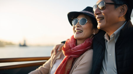 Happy asian senior couple traveling together on a boat in the sunset