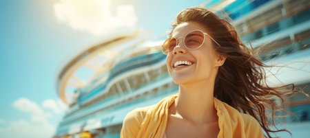 Head held high, a woman in cool eyewear smiles in front of a cruise ship. Her happy expression, jawline, and gesturing hands convey a sense of leisure and fun while traveling