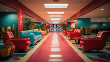 A stunning view of a bowling alley illuminated by vibrant red and blue neon lights, showcasing sleek lanes that create a dynamic and captivating atmosphere for players and enthusiasts alike.