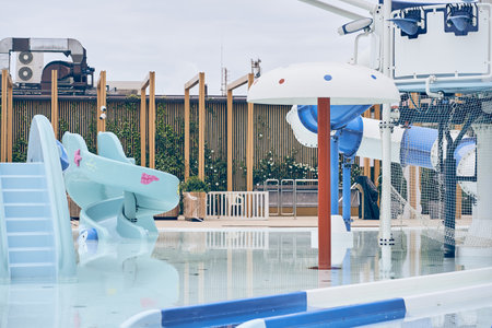 Water slides by the pool, a relaxation area by the pool. A water park without people on a cloudy summer day in the morning. With space to copy. High quality photo