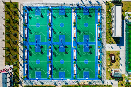Top view of kids playground near basketball court between residential condo buildings of big city. Aerial view to estate cityscape