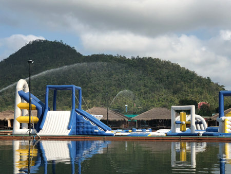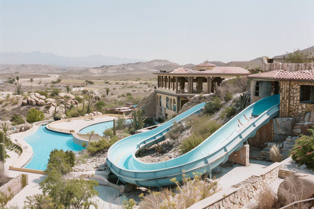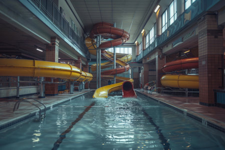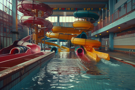 Water slide amusement park tourist attraction summer kids festivity festival joy pool with blue clear water vacation leisure time aquapark fast sliding pipes colorful resort entertainment center