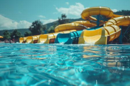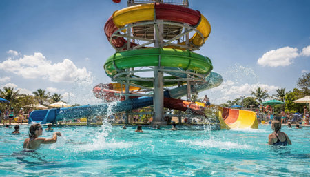 Vibrant water park scene with colorful slides and clear blue pool on a sunny day of fun