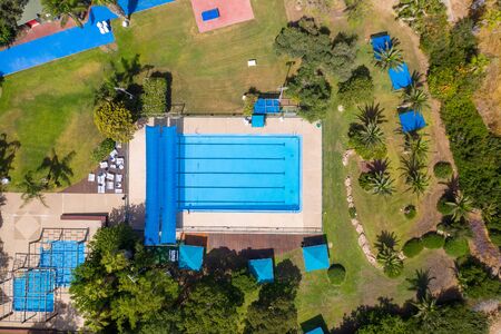 Aerial view of swimming pool on rooftop of hotel apartment building in sport club, urban city view. Relaxing in summer season in travel holiday vacation concept. Recreation lifestyle.