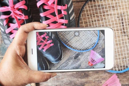 sportswear and earphones mobile-phone lifestyle flat lay overhead view. bottle,sportswear,sneakers and badminton racket on wooden background