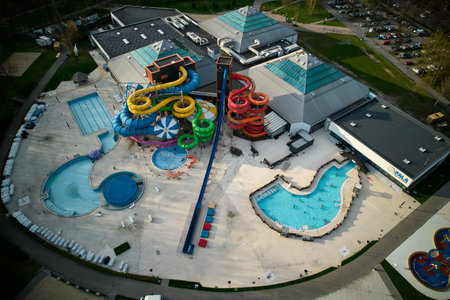Aerial city aquapark overview, colorful spiral tube slides, playgrounds visible, parking, sunny spring, spacious composition, Lodz Poland, drone photo, travel and editorial marketing