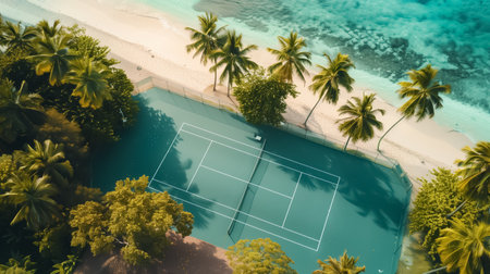 Sunny day bird eye view of a tennis court situated on a tropical beach with palm trees and a stunning blue ocean view in the background, emphasizing a beautiful beach setting.