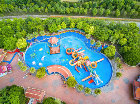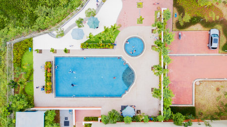 JAKARTA - Indonesia. February 07, 2022: Top down view of people playing on swimming pool while enjoying leisure time