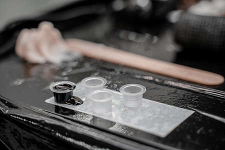 Close-up photo of tattoo master in black gloves pouring inks into plastic cup