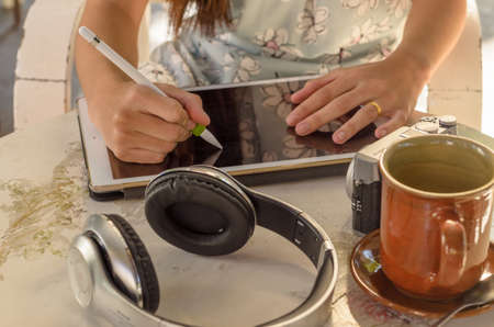 Woman use hand hold pen working in tablet,earphone and camera put on the table