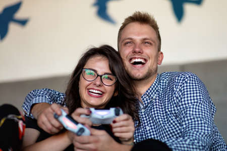 Young couple playing video games on console sitting together on couch at cozy living room. Lady happy to win victory, guy feeling disappointed. Concept of leisure activity of lovers at home.