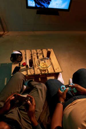 Close-up hands of unrecognizable man holding joystick and playing video games on console at home with friends. Closeup top view of male gamer pressing buttons on gamepad.