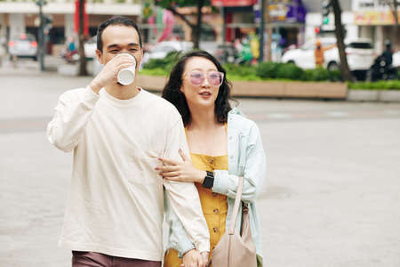 Young couple walking in the city, holding coffee cups and smiling.